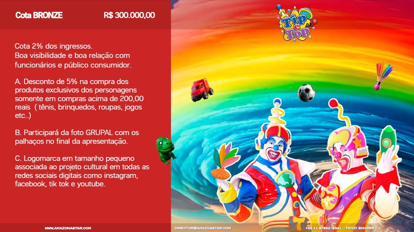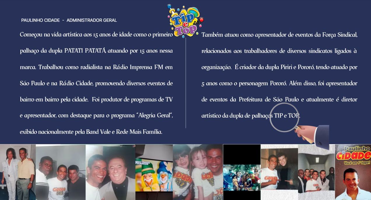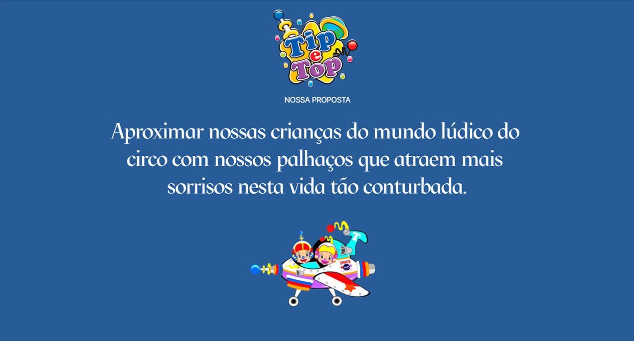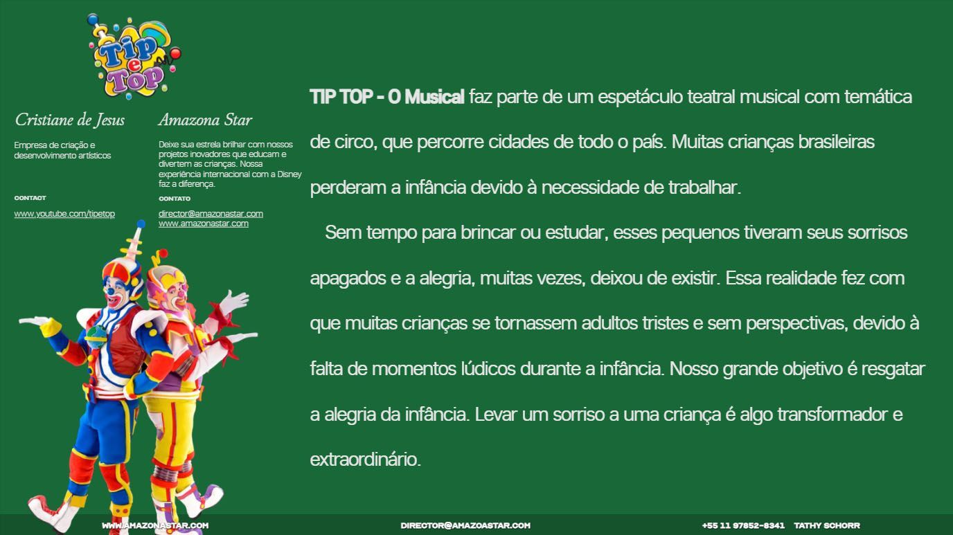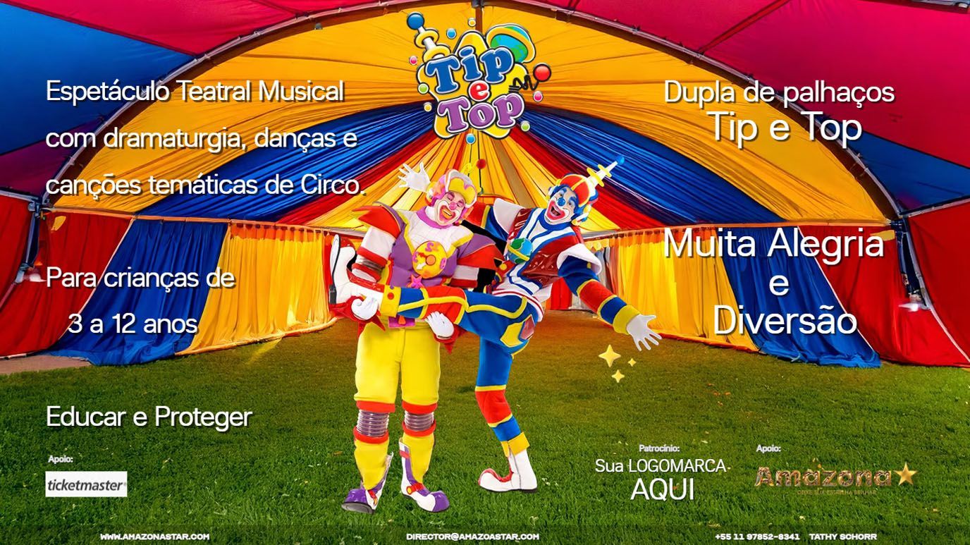 TIP TOP - O Musical fazem parte de um espetáculo teatral musical com dramaturgia, danças e canções com temática de circo que percorre as cidade e bairros de todo o país.