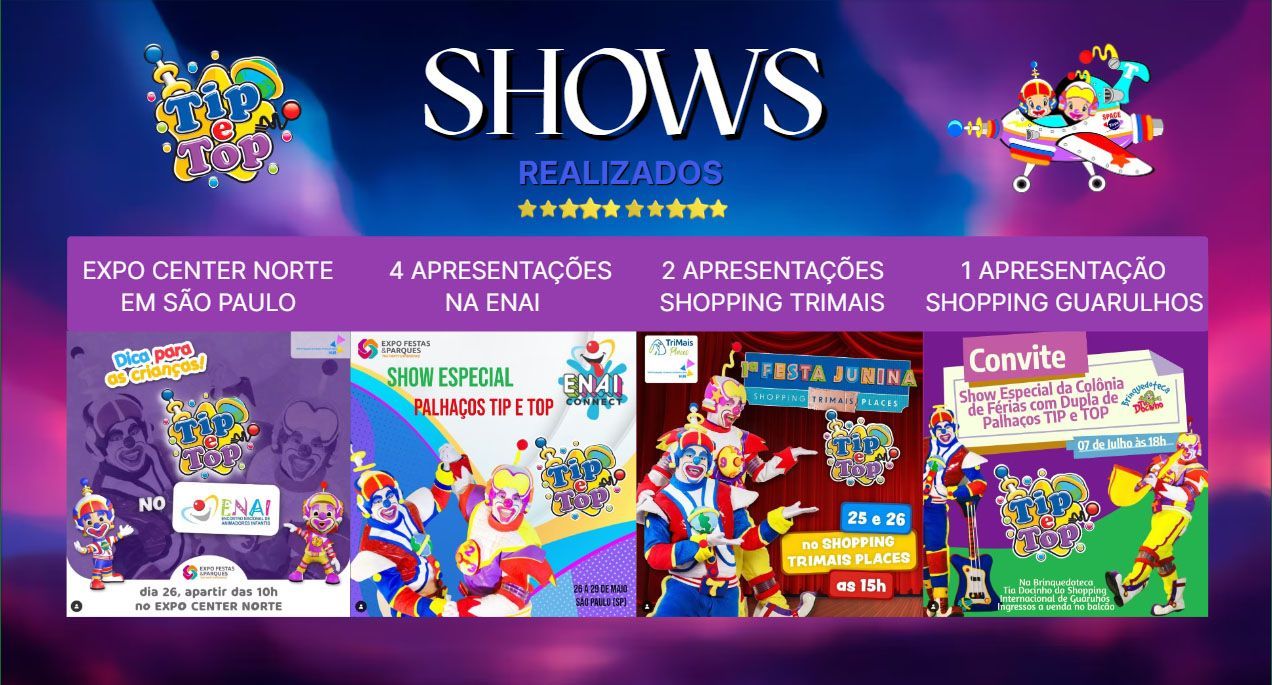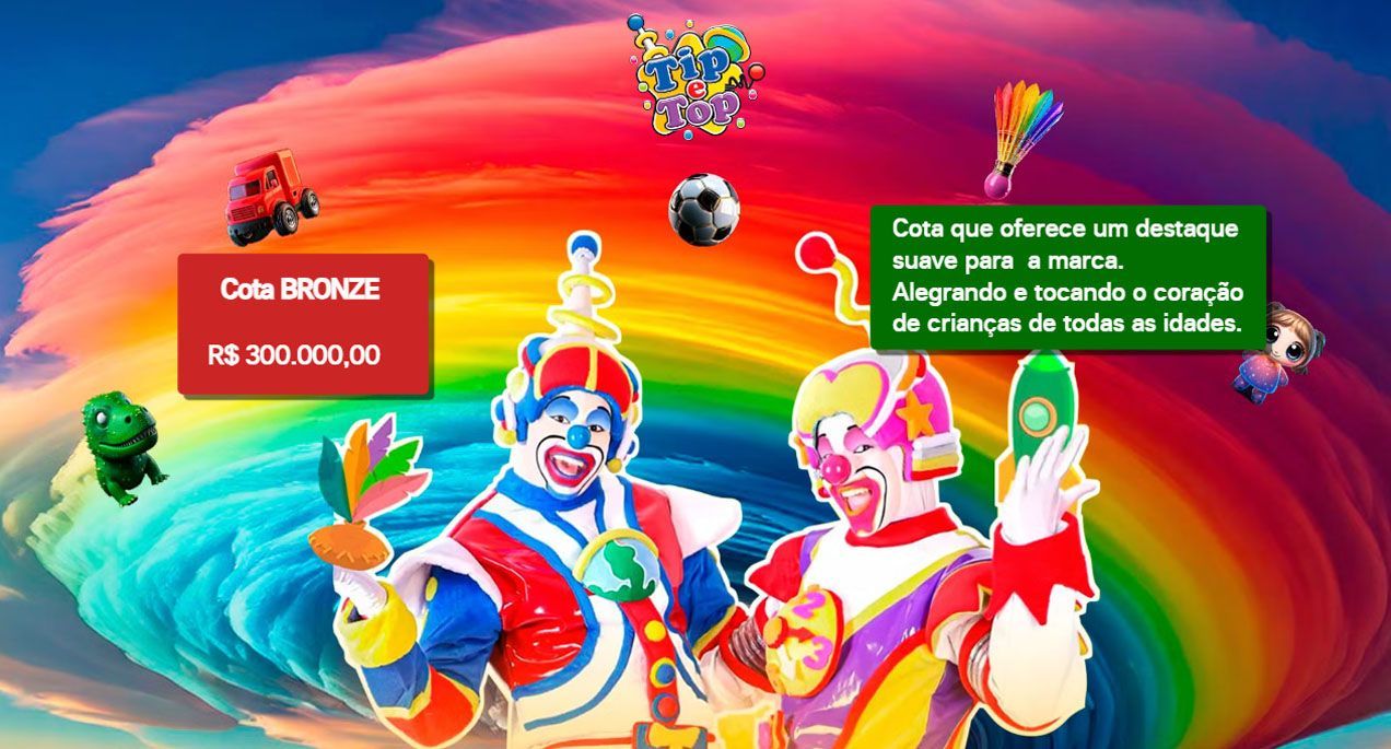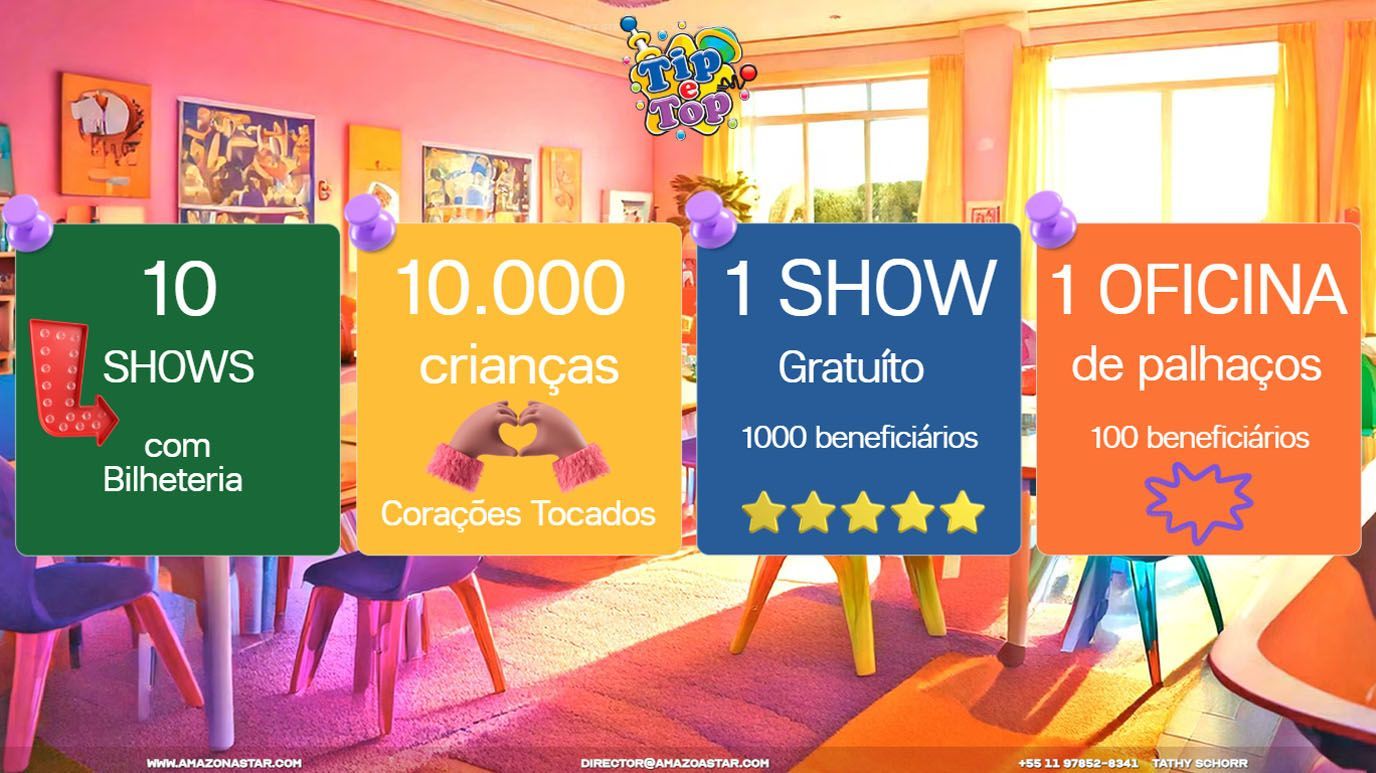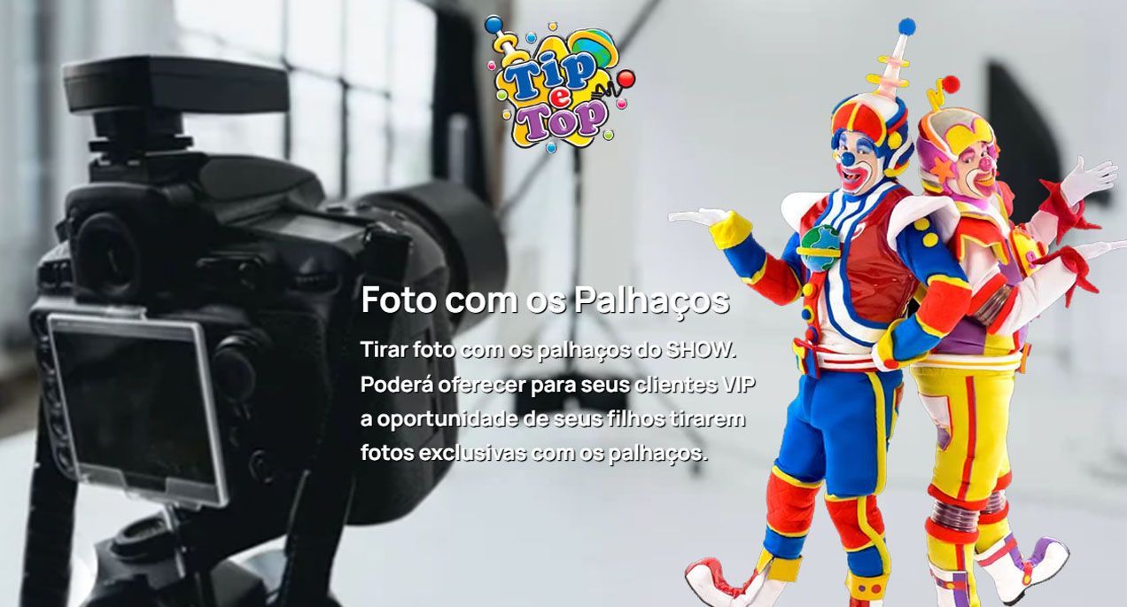 Para crianças entre 3 e 12 anos, a dupla de Palhaços TIP e TOP, com suas palhaças, vai trazer muita alegria e diversão para a criançada. Nosso grande objetivo é resgatar a alegria da infância. Levar um sorriso a uma criança é algo transformador e extraordinário.